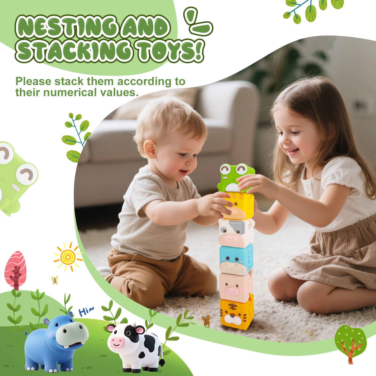 - 🐷Silicone learning blocks for babies:Combines number recognition (1-6), animal cognition (frog, giraffe, hippo & more), color sorting, and textured sensory exploration with 6 unique patterns – boosts cognitive development while stacking & nesting.